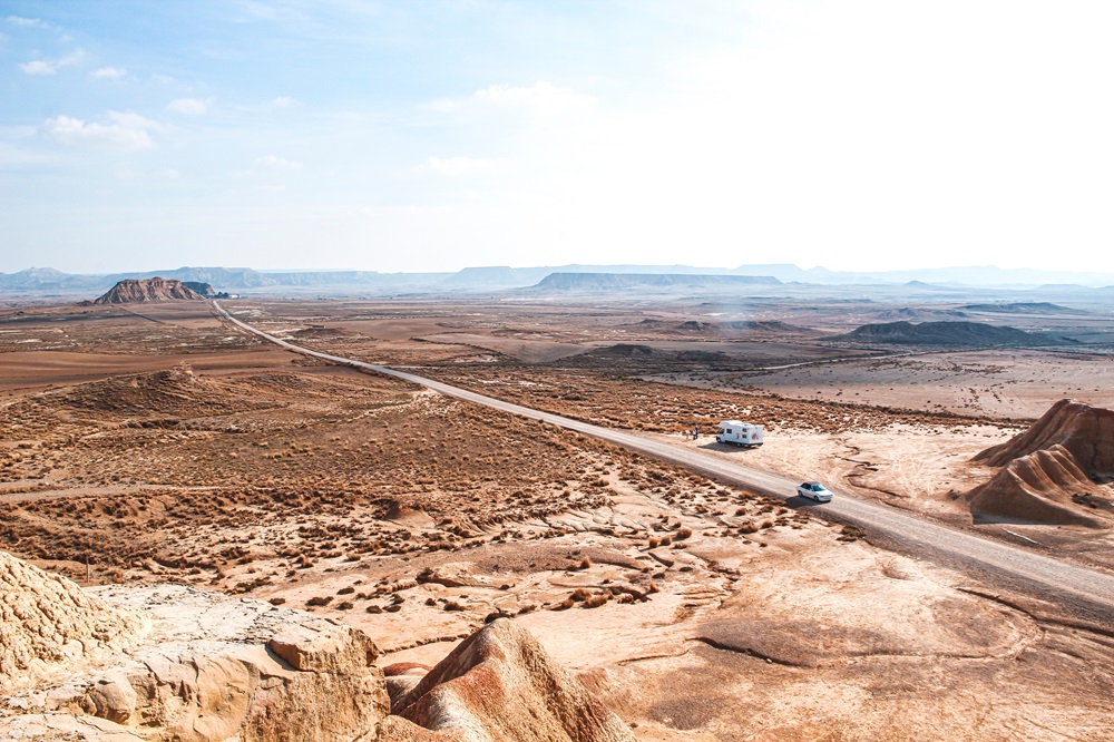 On s’enfonce sur les pistes balisées, à travers ses spectaculaires paysages d’érosion. Au nord, El Plano, la montagne plate – terres blanchâtres, substrat d’argile, végétation de steppe. Au sud, la Plana de la Negra, qui doit son nom à sa végétation méditerranéenne, pins d’Alep, chênes kermès, garrigue et bosquets de romarins. Et entre les vastes plateaux d’El Plano et de la Negra, les paysages bruts de la Bardena Blanca, la zone la plus désertique, qui provoque le dépaysement le plus grand. Ses formations rocheuses évoquent le Colorado et Monument Valley : majestueuses nuances de couleurs, montagnes qui font se superposer les teintes, rouge, vert ou blanc, et au-dessus de ses plaines arides, le vol plané des aigles royaux et des vautours – un Far West européen.