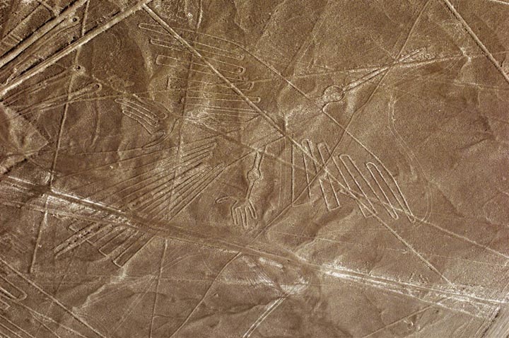 Il y a des mains, un cachalot, un condor de 134 mètres de long et un singe presqu'aussi grand, un héron, un astronaute dit-on, une araignée de 47 mètres, un jaguar que l'on appelle chien, un pélican et un colibri, si petit dans la nature, qui ici fait 50 mètres. 800 figues et 70 dessins biomorphiques décorent la pampa, et ne peuvent être vues que d'en haut. Les lignes, créées pense-t-on par les chamanes de la civilisation Nazca, dans les premiers siècles de notre ère, furent repérées dès la Conquista : Piedro Cieza de Leon les prend pour des pistes, en 1553. Ce n'est qu'en 1927 que l'archéologue péruvien Toribio Mejia Xesspe les redécouvre, et se rend compte de leur dessin.