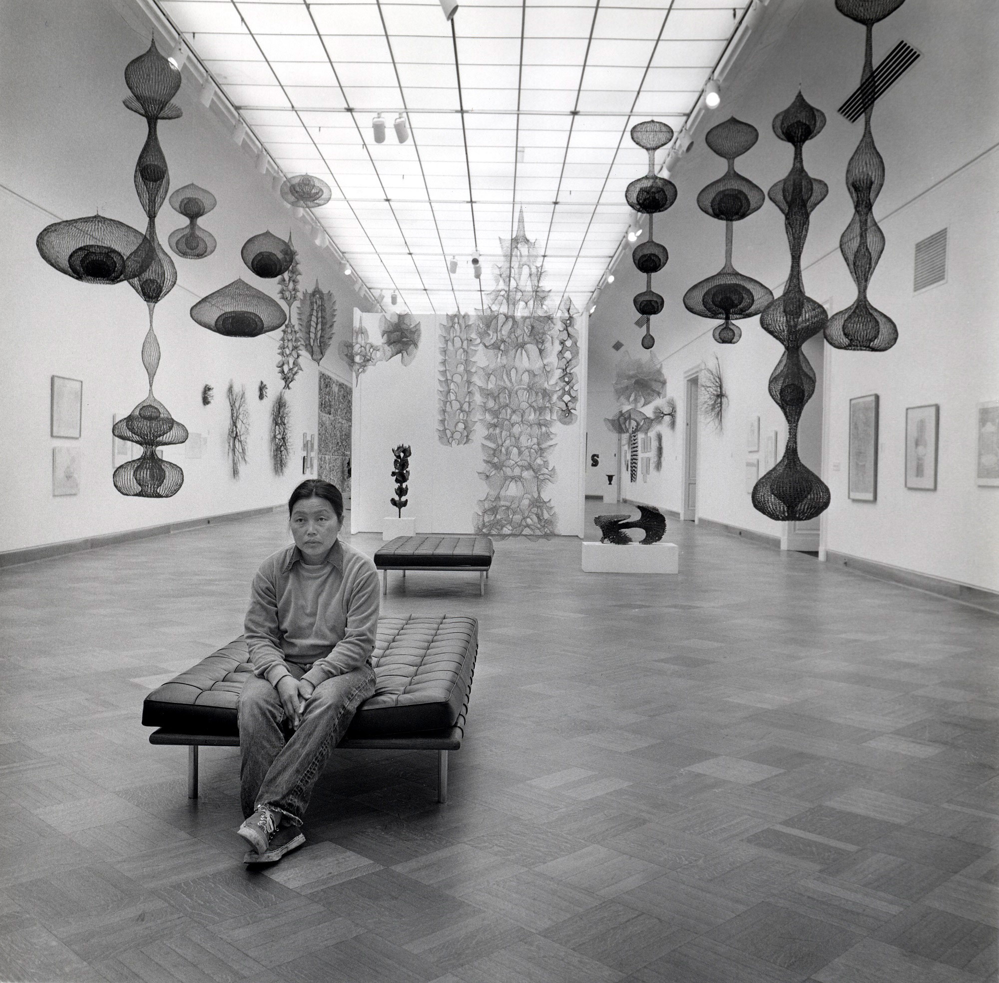 Ruth Asawa dans l’exposition “Ruth Asawa: A Retrospective View”, San Francisco Museum of Art, 1973. Photographie par Laurence Cuneo.