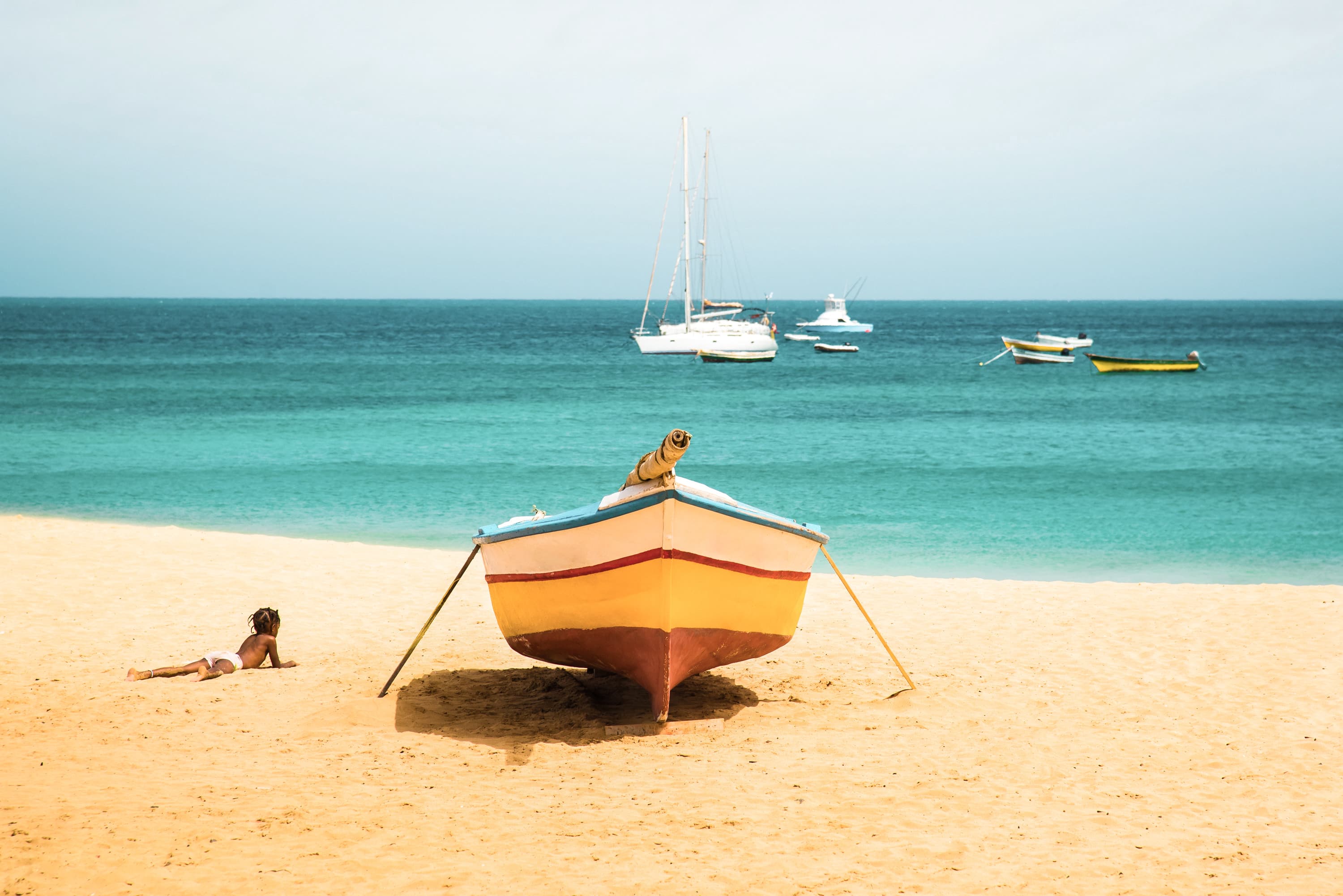 Nom court, beauté nue. Sal, c’est l’île des sables infinis, du soleil permanent, du bleu éclatant. Le vent y souffle presque toute l’année, balayant les plages comme des toiles vierges. Pas de reliefs vertigineux, pas de forêts luxuriantes – juste l’essentiel : du désert, de l’eau, du sel. C’est l’île la plus balnéaire du Cap-Vert, avec ses hébergements face à l’Atlantique, ses écoles de kitesurf et ses cocktails bien calibrés. On y pratique aussi la plongée, le surf, la planche à voile ou simplement l’art de marcher longtemps au bord de l’eau, en compagnie du vent. Sal cache aussi des trésors pour qui sait s’éloigner de Santa Maria : les salines de Pedra de Lume dans un cratère effondré, le port de Palmeira, la baignade dans le « Blue Eye » de Buracona. Une île où l’on cesse de courir, où l’on se laisse bercer par la rumeur de la mer.