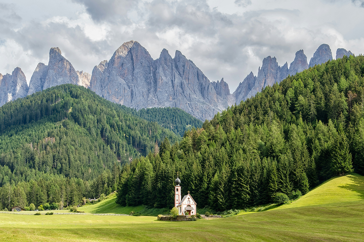 Un village minuscule, un paysage immense. Une localité agricole, préservée, où le temps semble suspendu – à peine quelques maisons regroupées autour d’une église au clocher pointu – et des prairies en pente douce, des forêts profondes, avec en toile de fond les aiguilles déchiquetées du massif des Odle. La petite église de Santa Maddalena devant les cimes acérées des Odle constitue aussi une des images emblématiques des Dolomites.
