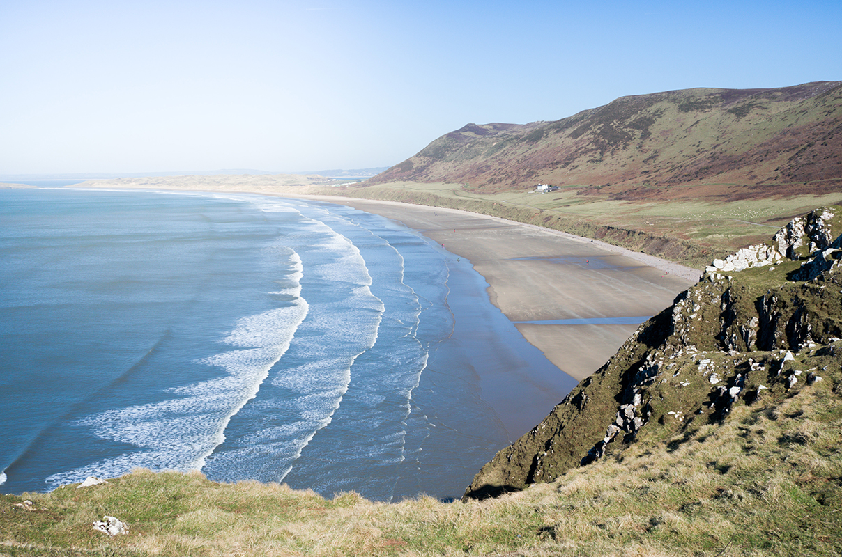 La péninsule de Gower s'étire à l'est du port de Swansea, sur la côte sud du Pays de Galles. Première région du Royaume-Uni à recevoir le label Area of Outstanding Natural Beauty, elle séduit par la diversité de ses paysages : les falaises herbeuses succèdent aux plages infinies. Rhossili Bay, joyau de la péninsule, dessine un arc de sable qui s’étire sur plusieurs kilomètres, battu par les vents. Les marées, elles, dévoilent d’immenses bancs de sable. Dans les terres, Gower affiche une beauté plus douce, déclinant les paysages agricoles rythmés par des pâturages ondulants et des villages dispersés aux maisons de pierre et toits d’ardoise.
