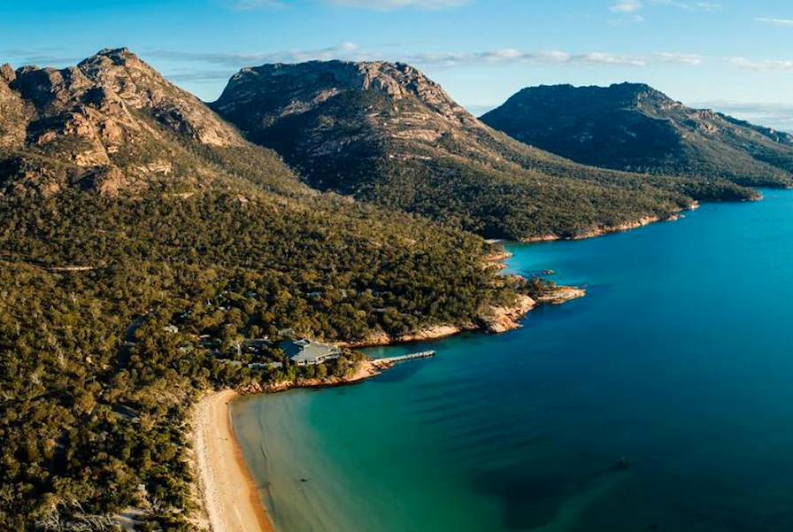 Départ pour la péninsule de Freycinet (2h30). L'axe traverse les eaux calmes du Pitt Water avant de piquer vers le nord, contournant la réserve de Mount Morrison pour fendre des paysages vallonnés. Après avoir retrouvé le littoral à Orford, la mer de Tasmanie escorte le véhicule sur les derniers kilomètres. Installation pour deux nuits à quelques minutes de la célèbre Wineglass Bay, non loin du parc national, dans un établissement qui s'efforce de s'intégrer avec respect à son environnement. Au nombre de dix, les studios sont modernes et confortables. Surtout, ils ouvrent sur les eaux de Tasmanie : Great Oyster Bay, Saltwater Lagoon, Friendly Beaches, mer de Tasman. En journée, on alterne entre pauses sur la plage, promenades sur la côte de la Wineglass Bay, sorties kayak et plongée. À l'heure des repas, direction le restaurant où se profile un mariage "fusion" entre produits tasmaniens et techniques de cuisine et de présentation japonaises.