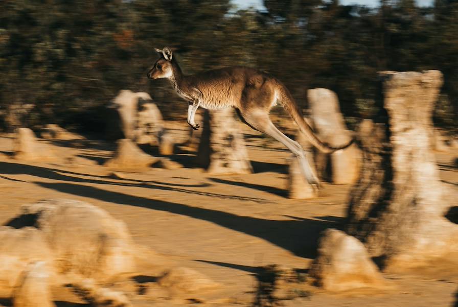 Au programme - Journée guidée autour de Perth. Le Pinnacles Desert se déploie au cœur du parc de Nambung, parc national côtier bordé d’une rive sauvage et de plages blanches. Là, les dômes calcaires des Pinnacles, vieux de plusieurs millions d’années, s'éparpillent par centaines au milieu du sable. Pour rejoindre ces curieuses formations autrefois recouvertes par l'eau, il faut emprunter l'Indian Ocean Drive. Comme son nom le laisse présager, celle-ci flirte avec le littoral, distribuant au passage de belles ouvertures sur la mer. En chemin, le parc national de Yanchep accueille des spécimens de kangourous, émeus et koalas – arrêt obligatoire. À Cervantes, on se régale dans une célèbre enseigne. Avant de clôturer la journée dans un petit village de pêcheurs réputé pour son commerce de homard et ses grandes dunes blanches. Tout au long de cette journée pleine de surprises, un guide mène le groupe – et la danse.