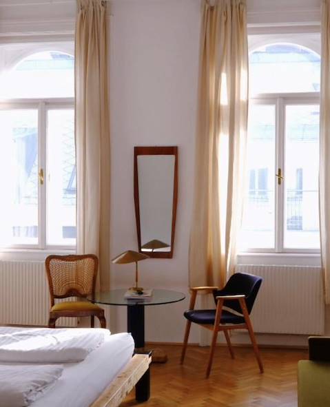Elle est située dans le quartier de Neubau (7e district), près de Mariahilferstrasse, entre le Museumsquartier et Westbahnhof. La façade – celle d'un immeuble classique autrichien – ne dit rien de l'expérience qui attend à l'intérieur. La trentaine de chambres défilent en coursive, déployées autour d'une agréable cour intérieure. Chaises et tables en fer occupent l'espace : la jeunesse locale s'y donne rendez-vous pour prendre un verre et les Viennois de tous âges, pour peu qu'ils soient initiés, afin de déguster une savoureuse cuisine… philippine ! Chop suey, pak choi et curry coco sont ici préparés à la perfection. Les chambres relèvent presque de la salle d'expo : pour les équiper, le design fut pioché quelque part entre les années 50 et les années 70. Le lendemain, petit déjeuner – non philippin – servi à table. Copieux et de bonne qualité, il met d'aplomb pour la journée. D'ailleurs, pour faciliter cette dernière, les transports en commun se situent à proximité (et vous bénéficiez de la Vienna Card, précieux sésame vous permettant de les emprunter de manière illimitée).