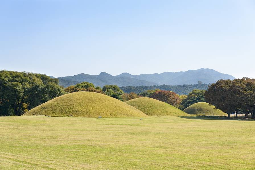 Embarquement pour 2h à bord du Korean Train Express (KTX) pour rejoindre, sur la côte sud-est du pays, la cité de Gyeongju. Capitale de l’ancien royaume de Silla (qui régna sur le pays pendant près d’un millénaire), Gyeongju regorge de vestiges de cette lointaine époque où la Corée fut pour la première fois unifiée. Au temple de Bulguksa et à la grotte Seokguram, sereins et solennels, l’attachement de l’ancienne dynastie au bouddhisme est encore prégnant. Le palace Donggung, résidence secondaire de la famille royale, flanqué de l’étang de Wolji, laisse entrapercevoir ce qu’a pu être, en son temps, le quotidien de l’élite. Pour accompagner celle-ci jusqu’à sa dernière demeure, direction la vallée. C’est ici que, sous la centaine de collines verdoyantes qui font le dos rond, les tombeaux des anciens rois sont dissimulés. Les trésors avec lesquels ils furent enfouis sont visibles au musée national.