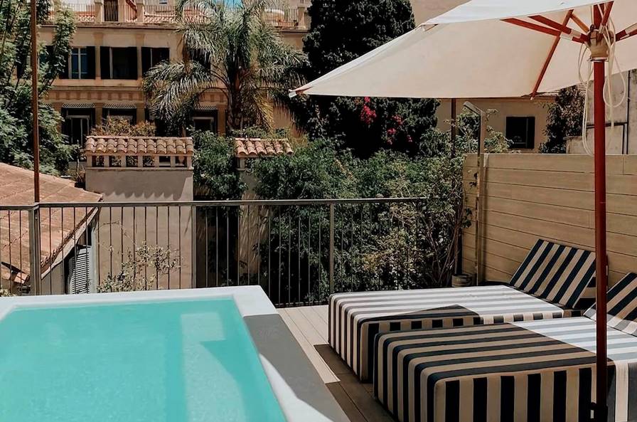 À l'arrivée, installation pour deux nuits à côté de la Plaza de España. Un emplacement on ne peut plus central donc, qui n'empêche pas pour autant votre hôtel d'être au calme. Les murs blancs dissimulent des canapés confortables, des tapis persans, des imprimés monochromes et un mélange de livres et d'objets vintage. L'ensemble est chaleureux, accueillant. Sur le toit, une petite piscine, plutôt rare dans le centre de Palma, permet aux enfants comme aux parents de rafraîchir leurs soirées.