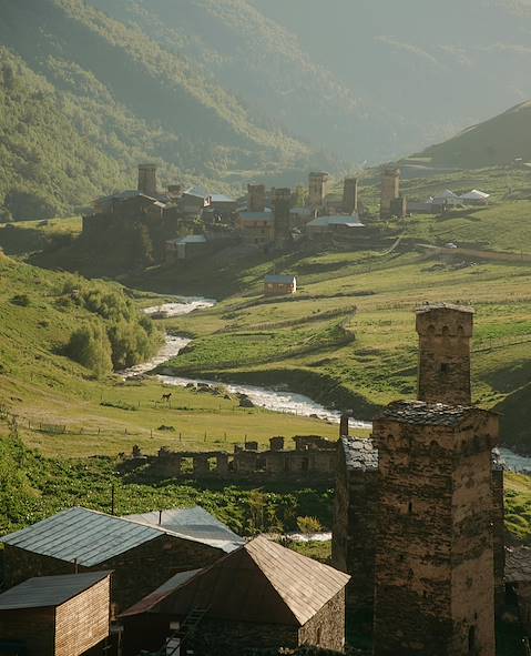 Au programme - En Haute-Svanétie. Les maisons-tours en pierre des Svanes, le peuple géorgien éponyme de la Svanétie, sont un motif saillant du paysage. D’origine médiévale, elles ont valu à la Haute-Svanétie son inscription au patrimoine mondial de l’Unesco. Il y en a plusieurs à Mestia-même. Avec votre chauffeur, vous allez à travers une spectaculaire contrée de montagne – neiges éternelles au-dessus de 3000 mètres – et de forêt – épicéa, sapin, hêtre, charme, etc. – jusqu’aux villages de la localité d’Ouchgouli, l’un des plus hauts habitats permanents d’Europe, 2100 mètres, au pied de la muraille de Bezengui. L’isolement a servi de conservateur patrimonial et les tours se dressent là sans concessions inutiles à la modernité. En 1929, Mikhaïl Kalatozov (ou, de son nom géorgien, Mikhaïl Kalatozichvili), futur réalisateur de Quand passent les cigognes, a filmé ici un documentaire pionnier d’une époustouflante beauté : Le sel de Svanétie.