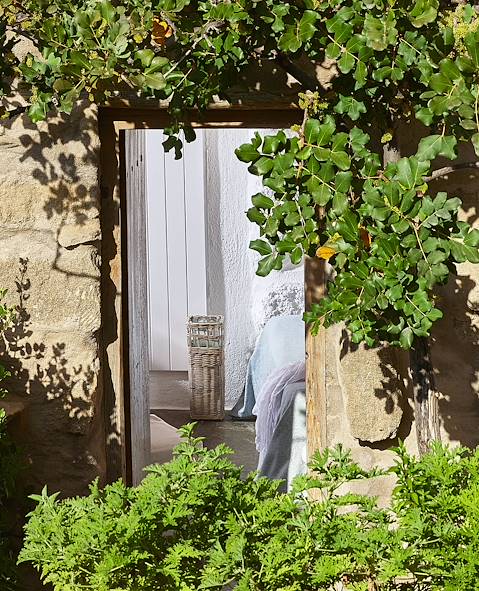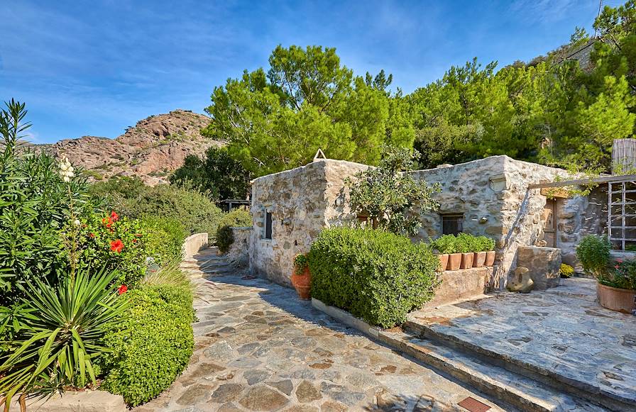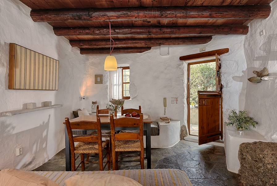 À l'arrivée à Makrigialos, installation pour quatre nuits dans un cottage situé à tout juste un kilomètre du village, dans les terres. Succombant au charme de ces anciennes maisons crétoises, le propriétaire les a restaurées dans le respect des traditions et avec un goût sûr, pour en faire de confortables petites bâtisses à l'atmosphère volontairement rustique, certaines étant même construites à flanc de rocher. Le choix est allé à la simplicité et au minimalisme avec des tomettes au sol, des murs blanchis à la chaux, des poutres apparentes et des lits creusés dans la roche. À chaque maisonnette son jardin planté d’oliviers, de caroubiers, de pins et de cactus. On séjourne ici parfaitement au calme, bien loin des foules.