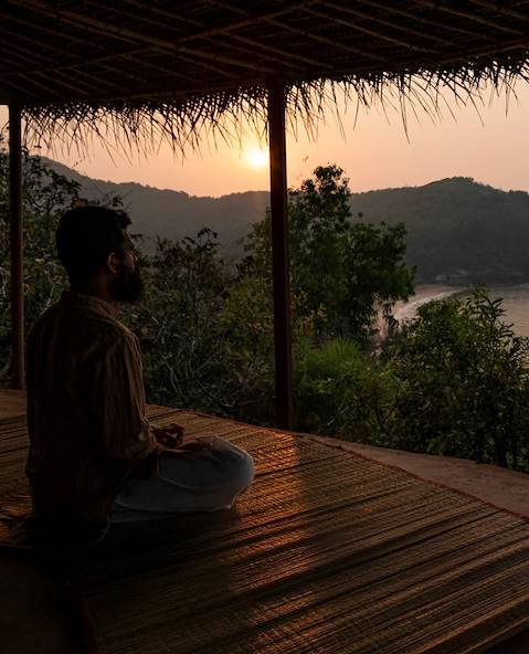 Transfert pour Gokarna en véhicule privé avec chauffeur. Trois heures durant, le véhicule s'aventure le long de la côte, flirtant avec le littoral et ses plages. En chemin, quelques langues de sable et temples hindous forment des haltes relaxantes et confirment la primauté de l'Inde du Sud sur ces deux plans. À destination, installation pour cinq nuits sur les rives de la mer d'Arabie, en surplomb d'une très jolie plage paisible. Blottie au cœur d'une dizaine d'hectares de végétation, votre adresse ambitionne d'apaiser corps et esprit. Alignés dans cet univers contemplatif, vingt-quatre bungalows bâtis dans le style traditionnel konkani reçoivent les hôtes dans des intérieurs épurés, tirant joliment des matières naturelles. La chambre, calme, est prolongée d'une salle de bain en partie ouverte. Chaque jour, vous composez votre programme tourné vers le ressourcement : méditation, ayurvéda, naturopathie, massages, yoga...