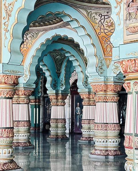 Au programme - La visite privée de Mysore. Lorsqu’en 1912, le maharadja de Mysore vit terminée sa nouvelle demeure, il dut certainement se féliciter d’avoir choisi l’architecte Henry Irwin pour la réaliser. Car il faut être le Taj Mahal pour attirer aujourd’hui plus de visiteurs que le majestueux Mysore Palace. Durant la visite, on gravit aussi les mille marches de Chamundi Hills, au sommet desquelles se dresse le temple Sri Chamundeswari, dédié à Shakti, consort de Shiva et déesse tutélaire des maharadjas locaux. À mi-pente, on rencontre d’ailleurs le vahana (monture de Shiva), le taureau Nandi, sculpté au XVIIe siècle dans un bloc de granit cyclopéen. De là-haut, le panorama est splendide. Au retour, promenade au marché.