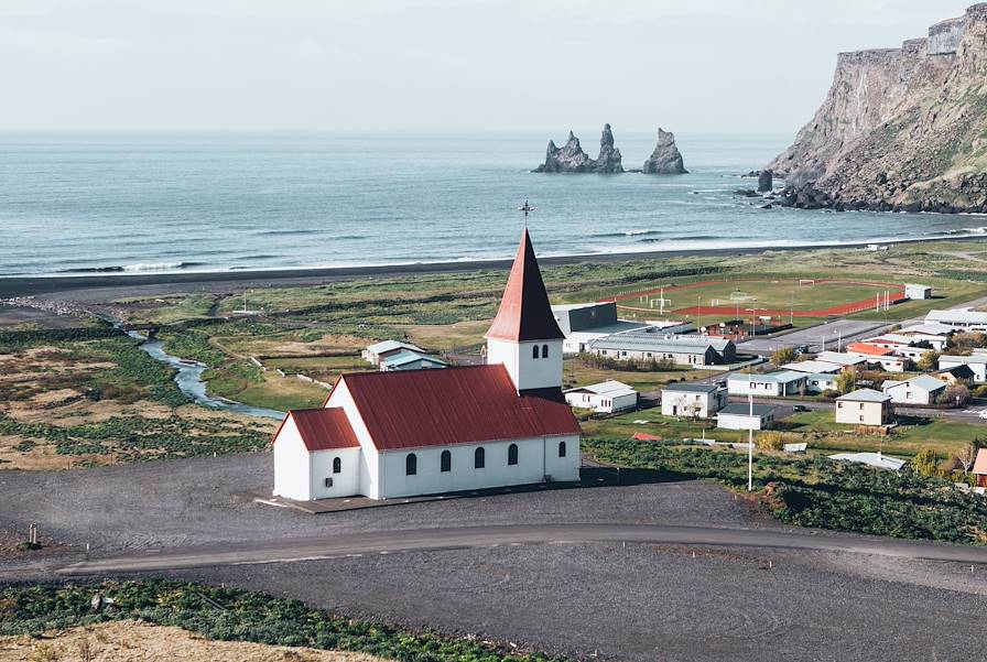 Vous disposez d'une journée pour profiter librement de Vik et de ses environs. Le village de Vik est niché au pied de collines verdoyantes, bordé de falaises où volent les macareux. Dix rues, des maisons colorées et une petite église blanche sur un promontoire, avec vue plongeante sur l’océan. Et, par-delà une langue de sable noir, la silhouette de piliers de basalte qui se découpent à l’horizon. Le long de la côte, n'hésitez pas à faire autant de haltes que nécessaires pour admirer les paysages de toute beauté : plages de sable noir, falaises abruptes que les oiseaux transforment en cités dortoirs, cascades vertigineuses, lagunes glaciaires... On gardera en mémoire le vert des collines, le noir des falaises, le blanc du glacier Mýrdalsjökull.