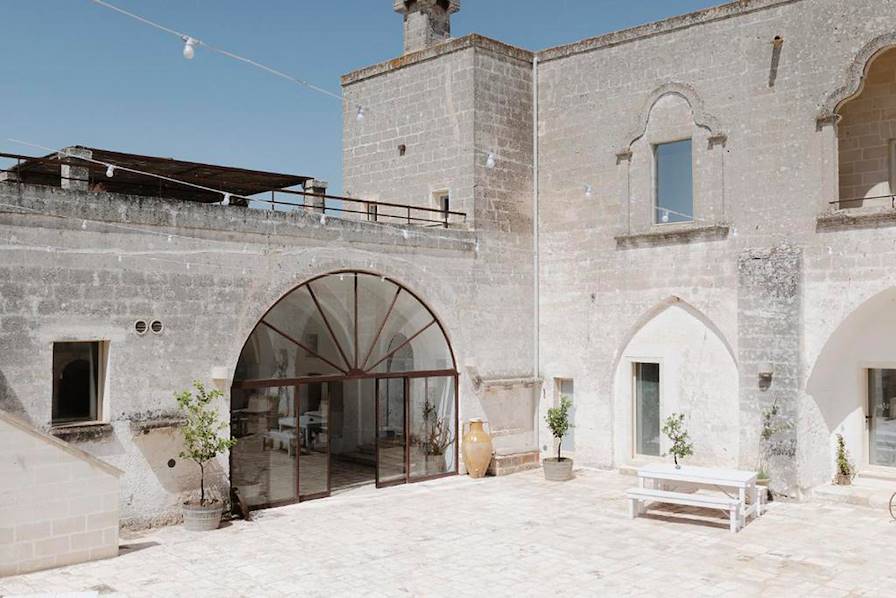 À l'arrivée, prise en main de la voiture de location et route pour Lecce, à quarante kilomètres de là. À travers la fenêtre défilent les premières images des Pouilles : nature sauvage, flots bleus et falaises percées de criques. Parvenu à Lecce, installation pour trois nuits au sein d’un palazzo pluricentenaire. Les chambres se déploient autour d'une ravissante cour arborée. Habillées de tons clairs pour ne pas éclipser les murs de pierre apparente, elles dévoilent un confort certain au premier coup d’œil. Au dernier étage, un joli toit-terrasse offre une vue mémorable sur les toits de la ville – l’occasion de projeter l’itinéraire qui sera entrepris dès le lendemain, après un revigorant petit déjeuner.