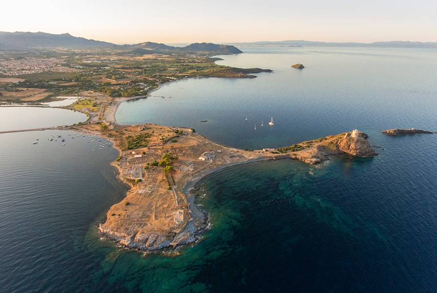 À ne pas manquer en chemin - Le site archéologique de Nora. Celui-ci protège les vestiges de l’une des premières villes fondées sur l'île par les Phéniciens au VIIIe siècle avant J.-C. Elle passe ensuite aux mains des Carthaginois puis des Romains. Aujourd’hui, cette zone est dans un état exceptionnel de conservation. Parmi les principaux monuments à voir : le théâtre surplombant la mer, à l’origine recouvert de marbre et encore utilisé pour héberger des expositions culturelles, mais aussi les bains, les rues pavées, les temples, les villas et leurs mosaïques.