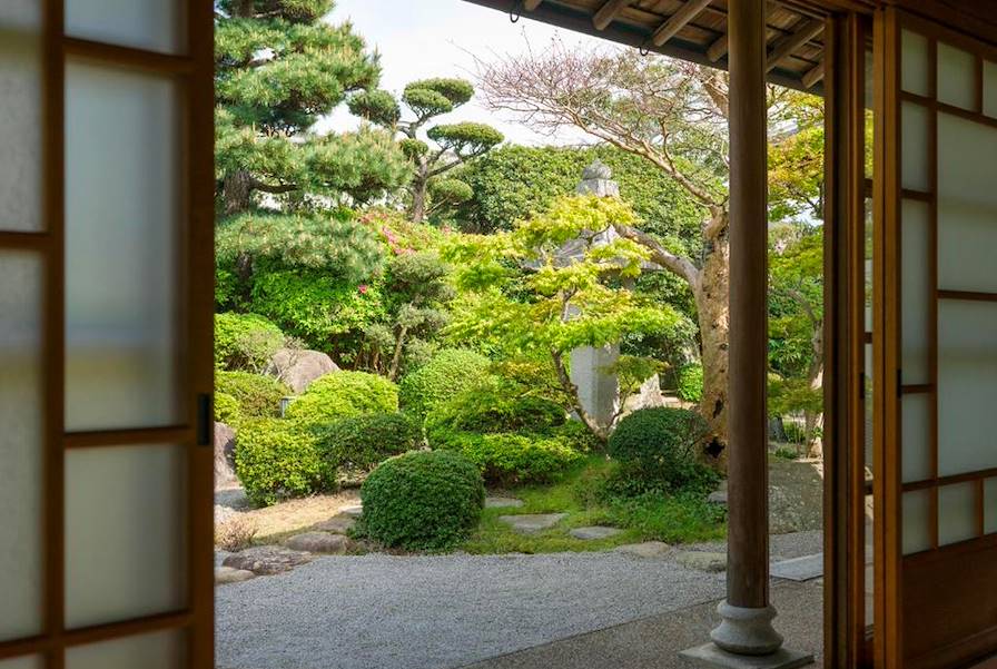 Prise en main de la voiture de location et route pour Tottori. Au passage, dans le San’in Kaigan Geopark, on admire le plus vaste champ de dunes du pays : quatorze kilomètres de long sur deux et demi de large, et de jolies hauteurs frémissantes. Nuit à l’ouest de Tottori. Misasa est un onsen. Le terme désigne aussi bien la source elle-même que le centre thermal qui se développe autour. Votre ryokan se trouve dans la rue principale, le long de la rivière. Le bâtiment est en bois, les sols en tatamis. L’atmosphère tient à ça. Les chambres ouvrent sur un coin de jardin, une suggestion végétale. De quoi songer, assis dans les fauteuils installés devant. Les hôtes ont à leur disposition des bains publics, intérieurs et extérieurs, mais aussi des bassins de plein air, possiblement privés. La cuisine est très soignée. En automne-hiver, le chef prépare avec prédilection le crabe des neiges pêché sur la côte. Le bœuf de Tottori est un autre ingrédient phare. L'occasion de faire l’expérience de l’umami, ce cinquième goût identifié par les Japonais.