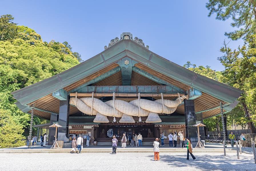 Route pour Izumo, au sud-ouest du lac Shinji. L’Izumo no ôyashiro est l’un des plus vénérables sanctuaires shinto du Japon. Sous sa forme actuelle, il date du XVIIIe siècle et c'est un véritable trésor national. Nuit dans un élégant ryokan dont les origines remontent à l’ère Meiji. Une rénovation récente lui a donné beaucoup de chic. Les chambres sont de différents types, du plus traditionnel au mieux adapté aux conventions modernes. Quel qu’en soit le style, elles sont toutes empreintes d’une sobre élégance et offrent confort et atmosphère. La cuisine kaiseki du restaurant prend ses ingrédients aux saisons, à la mer et à la campagne. Le chef compose avec cela des petits plats qui ne s’oublient pas. Parmi ceux-ci, une célébrité locale, le soba gris (nouilles à la farine de sarrasin complète). Raccord avec l’esprit des lieux et donnant sur le jardin, la salle à manger contribue au plaisir des repas.