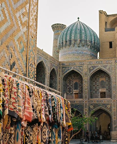 Déjà prévue - Visite privée de Samarcande, la cité bleue. Avec un guide francophone, on commence au Régistan, la place où étaient rendus publics les actes du pouvoir. Là sont trois madrasas fameuses : Oulough Beg (XVe siècle), Cher Dor (XVIIe siècle) et Tilla Qari (XVIIe siècle). Ensuite, c’est le Gour Emir, le tombeau de l’émir, construit par Tamerlan pour l’un de ses petits-fils. Le conquérant y est enterré lui aussi ; la psalmodie de la prière des morts sur le cénotaphe de jade vert remue. Cet édifice majestueux a inspiré la grande architecture moghole ; le Taj Mahal n’est pas sans dette envers lui. C’est encore à Timur Lang que l’on doit la mosquée Bibi Khanym (XVe siècle), une réalisation novatrice incluant des éléments de marbre. La légende veut que le port du voile par les femmes de Samarcande soit lié à un baiser que l’architecte de l’ouvrage aurait extorqué à la première épouse du commanditaire. Au pied de la mosquée se trouve le grand bazar, où sont en variété pains, fruits secs, légumes, épices, fromages, etc.