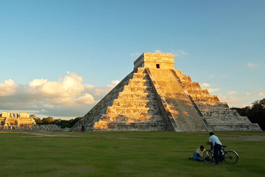 Au programme - Chichén Itzá en privé. Ces jours-ci, on se déplace en voiture avec chauffeur. Et pour commencer, vous visitez avec un guide francophone privé l’une des plus fameuses cités du monde maya : Chichén Itzá. La pyramide de Kukulcán est tout particulièrement célèbre pour la rigueur et la sophistication astronomique de sa conception. Kukulcán, c’est le Serpent à plumes des Mayas, le Quetzalcoatl des Aztèques, le dieu-maïs qui a des feuilles-plumes et des grains-écailles. Aux solstices et aux équinoxes, il ondule sur les flancs de la pyramide.