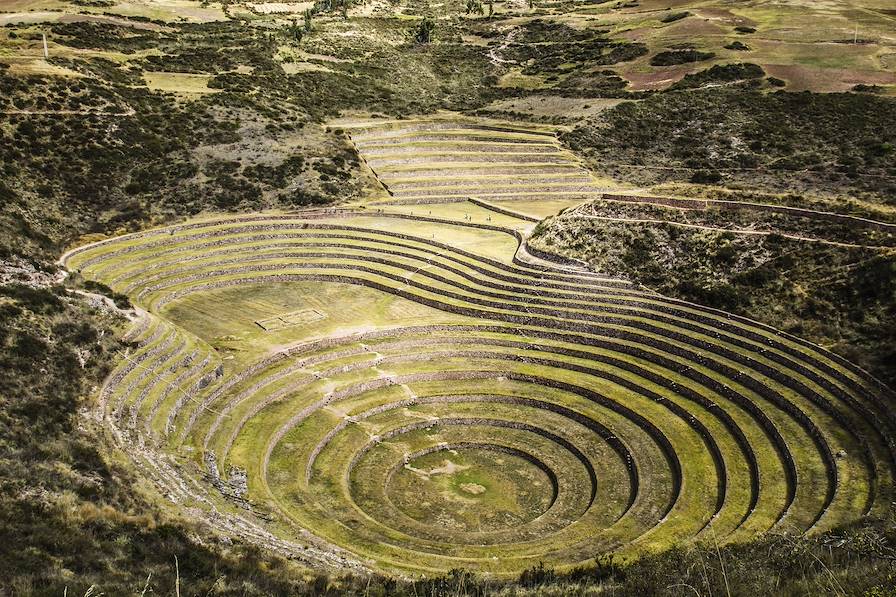 Déjà prévu au programme - On est amené sur zone en voiture puis, en compagnie d’une guide privé francophone, on commence ses explorations pédestres par les terrasses concentriques du centre de recherche agronomique inca de Moray. Le dispositif permettait de reproduire artificiellement différentes conditions climatiques et de mettre ainsi au point des protocoles d’acclimatation de plantes allogènes. On ira ensuite, en descendant doucement à travers une belle contrée agreste que domine la cordillère de Vilcabamba, vers les salines de Maras, dont les milliers de bassins composent un étrange paysage alvéolaire et blanc. Cette journée au vert comporte trois heures de marche environ.