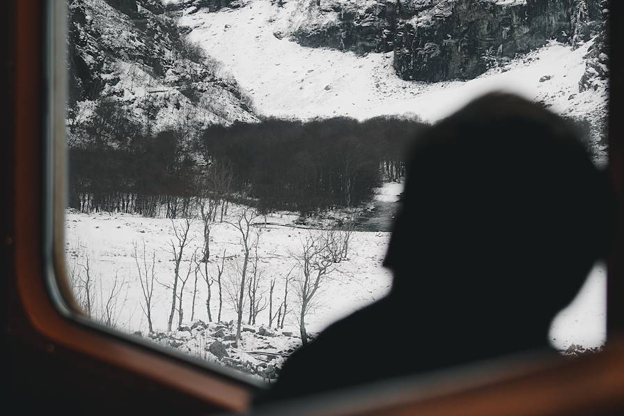 Après une bonne nuit de sommeil, bercé par le ronronnement du train, le réveil s’accompagne d’une impatience joyeuse à lever le store pour découvrir les paysages. La lumière est vive mais froide, drapant le panorama d’une brume mystérieuse. Au cours de la matinée se succèdent des paysages de forêts, de prairies et de lacs ponctués d’occasionnels villages à l’architecture typiquement scandinave.